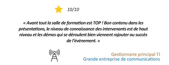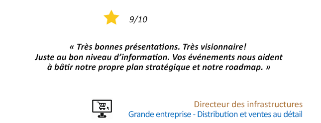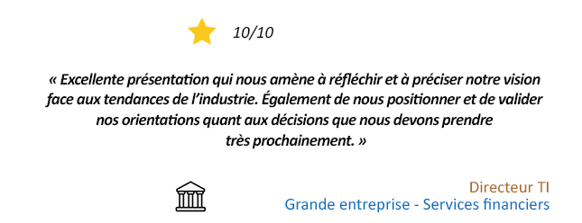 Présentations exécutives à l’attention des CIOs, VPs et Directeurs TI. Témoignages d’experts et de clients invités sur un sujet donné. Exploration des enjeux rencontrés, des tendances et des impacts observés au sein de l’industrie. Échangez et questionnez les résultats obtenus par ces entreprises à ce jour.