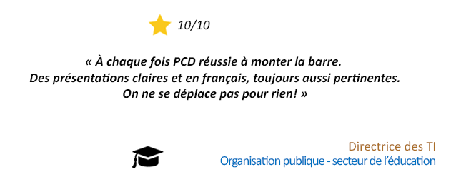 Qu’elles soient physiques ou virtuelles, nos sessions sont conçues avec le plus grand soin afin de vous faire profiter d’un contenu personnalisé, efficace et pertinent. Nous vous aiderons à comparer les pratiques actuelles de votre entreprise et à en apprendre davantage grâce aux présentations, aux exemples de cas vécus et aux expériences de projets partagées.